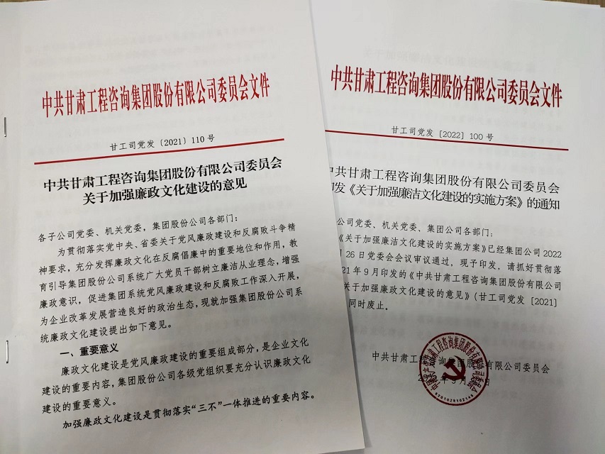 作為新組建的產業(yè)集團,甘肅工程咨詢集團把資產整合、產業(yè)耦合和文化融合作為集團公司組建的重要內容,其中讓廉潔文化建設在企業(yè)文化建設中先行一步,早安排早部署,2021年9月集團公司黨委研究印發(fā)《關于加強廉政文化建設的意見》,在中共中央辦公廳《關于加強新時代廉潔文化建設的意見》和省委《實施方案》印發(fā)后,又及時對標、查缺補漏,2022年9月修訂印發(fā)《關于加強廉潔文化建設的實施方案》,為新時代集團公司加強廉潔文化建設提供了指導。自組建以來,集團公司廉潔文化建設力求在“內化于心”上下功夫,在“外化于行”上求實效,引導干部職工廉潔從業(yè),廉潔用權,積極營造“崇廉、尚廉、倡廉、守廉”的企業(yè)風尚和發(fā)展氛圍。
