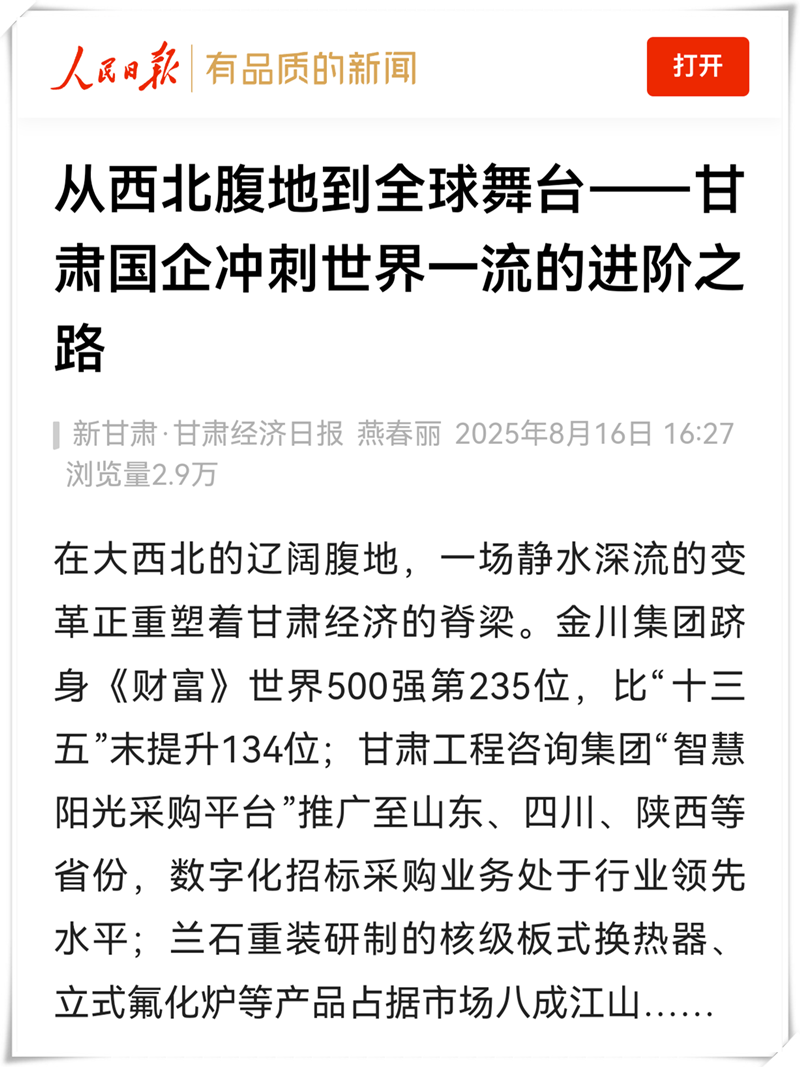 從世界500強的跨越到全國市場的深耕,從技術平臺的輸出到核心產(chǎn)品的壟斷,這些看似分散的閃光點,實則是甘肅國企在不同賽道上奮力奔跑的足跡。這些閃光的坐標,共同勾勒出甘肅國企向世界一流奮力攀登的壯闊圖景。