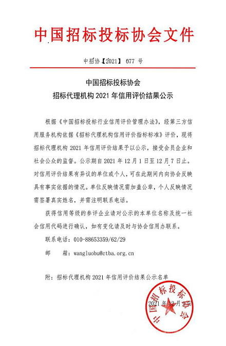 近日,在中國招標(biāo)投標(biāo)協(xié)會牽頭組織的2021年招標(biāo)代理機構(gòu)級信用評價認證工作中,經(jīng)中招協(xié)委托的第三方信用服務(wù)機構(gòu)(國資委)商業(yè)信用中心及有關(guān)行業(yè)專家評審,招標(biāo)咨詢集團子公司甘肅省招標(biāo)中心有限公司和甘肅金安建設(shè)工程項目管理有限公司獲得2021年招標(biāo)代理機構(gòu)AAA級信用評價最高等級認證。