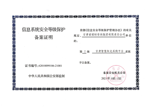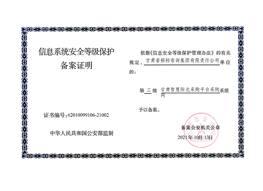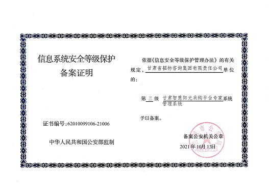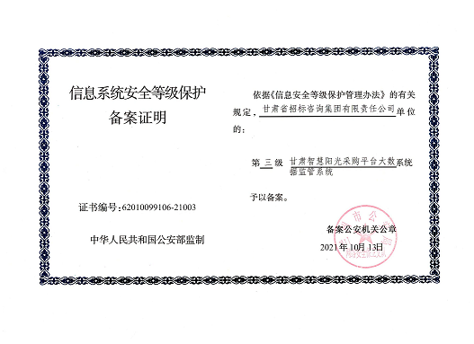 甘肅智慧陽光采購平臺“六大系統(tǒng)”于2021年10月13日完成定級、備案,近期完成安全建設(shè)和整改、信息安全等級測評、信息安全檢查,順利通過國家三級等保認(rèn)證,使平臺系統(tǒng)具有完善的防火墻、入侵檢測、數(shù)據(jù)加密以及災(zāi)難恢復(fù)等網(wǎng)絡(luò)安全設(shè)施和管理制度。