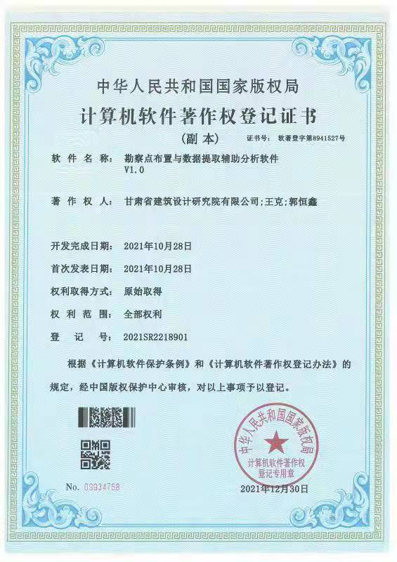 近日,從國家版權(quán)局傳來好消息,根據(jù)《計(jì)算機(jī)軟件保護(hù)條例》《計(jì)算機(jī)軟件著作權(quán)登記辦法》規(guī)定,甘肅省建筑設(shè)計(jì)研究院有限公司工程勘察院研發(fā)的“勘察點(diǎn)布置與數(shù)據(jù)提取輔助分析軟件”,經(jīng)專家審核,授予計(jì)算機(jī)軟件著作權(quán)登記證書。