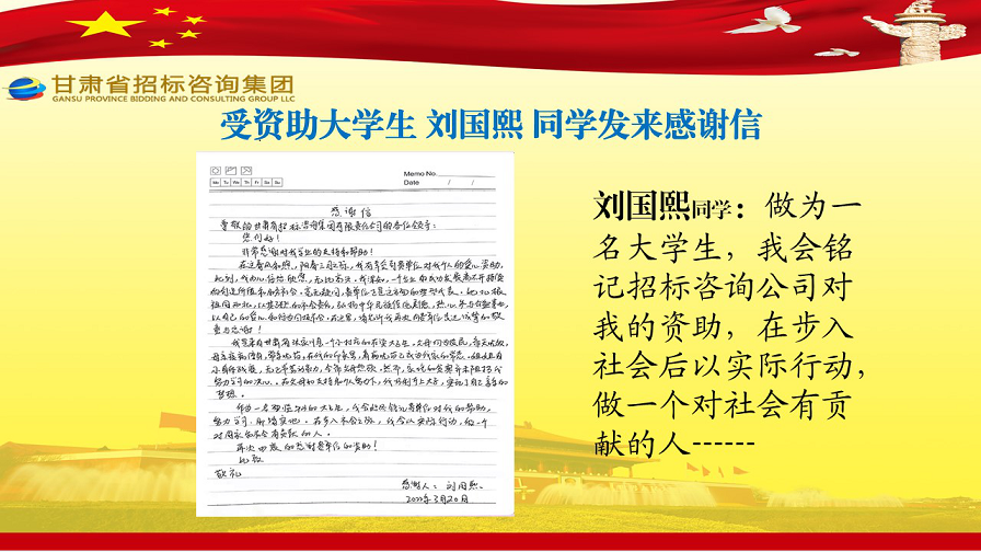 近日,張家川縣張棉驛鄉(xiāng)張棉村貧困大學(xué)生代表劉國(guó)熙、周長(zhǎng)斌、李雪峰等向甘肅省招標(biāo)咨詢(xún)集團(tuán)有限責(zé)任公司發(fā)來(lái)感謝信,就招標(biāo)咨詢(xún)集團(tuán)給予學(xué)費(fèi)資助一事表達(dá)他們的感激之情。