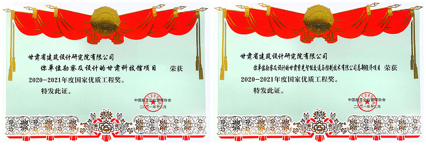 日前,從中國施工企業(yè)管理協(xié)會傳來喜訊,由甘肅省建筑設計研究院有限公司勘察及設計的“甘肅科技館項目”和“甘肅紫光智能交通與控制技術有限公司總部經濟項目”榮獲2020—2021年度國家優(yōu)質工程獎。