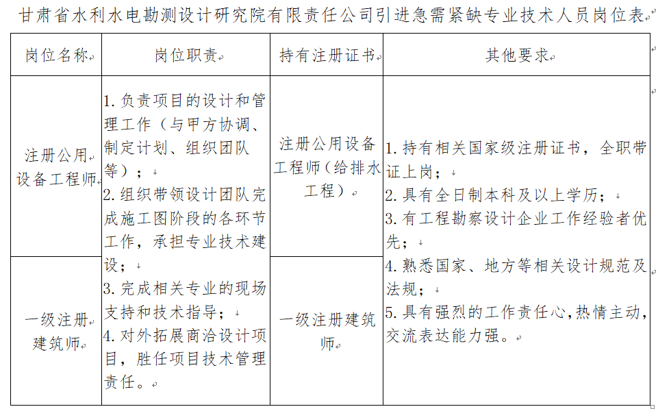 甘肅省水利水電勘測(cè)設(shè)計(jì)研究院有限責(zé)任公司因工作需要,根據(jù)公司《員工招聘與錄用管理辦法》,經(jīng)研究決定,面向社會(huì)公開引進(jìn)急需緊缺專業(yè)技術(shù)人員。現(xiàn)將有關(guān)事項(xiàng)公告如下: