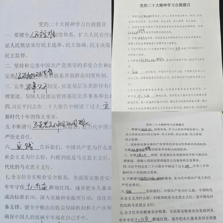 開(kāi)展答卷測(cè)試,檢驗(yàn)學(xué)習(xí)成效。招標(biāo)咨詢集團(tuán)第三黨支部所屬咨詢中心采取線上視頻會(huì)議的方式組織全體黨員居家學(xué)習(xí)黨的二十大報(bào)告原文,通過(guò)學(xué)原文、悟原理、反復(fù)學(xué)、時(shí)常悟,深刻領(lǐng)會(huì)和準(zhǔn)確把握?qǐng)?bào)告的精神實(shí)質(zhì)、豐富內(nèi)涵和核心要義。同時(shí),對(duì)黨的二十大報(bào)告相關(guān)知識(shí)開(kāi)展應(yīng)知應(yīng)會(huì)測(cè)試,通過(guò)答卷的方式檢驗(yàn)黨員干部對(duì)黨的二十大精神的理解和把握,達(dá)到以考促學(xué)、以學(xué)促用、學(xué)用結(jié)合、知行合一的目的。