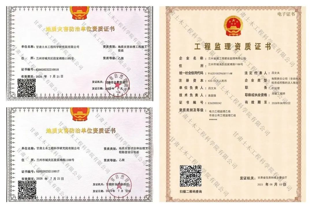 近期,土木工程院申報(bào)的地質(zhì)災(zāi)害評(píng)估和治理工程勘查設(shè)計(jì)乙級(jí)、地質(zhì)災(zāi)害治理工程施工乙級(jí)兩項(xiàng)資質(zhì)獲省自然資源廳批準(zhǔn)。土木工程院全資子公司蘭州金建工程建設(shè)監(jiān)理有限公司申報(bào)的電力工程監(jiān)理乙級(jí)資質(zhì)也順利通過省住房和城鄉(xiāng)建設(shè)廳審批。